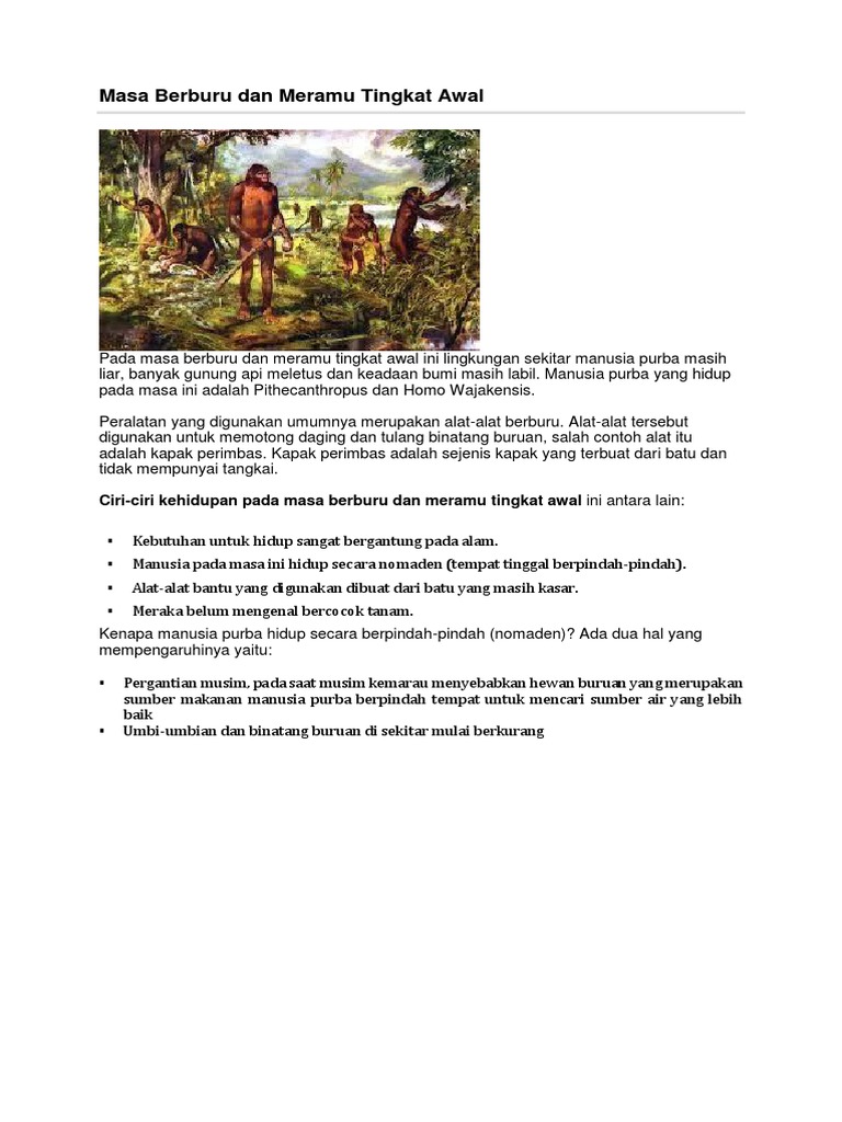 Masa berburu dan meramu adalah masa ketika manusia purba untuk mendapatkan makanan dengan cara berburu dan mengumpulkan makanan yang tersedia dari alam. Hidup nomaden atau berpindah pindah 4. Corak kehidupan manusia purba pada masa berburu dan meramu masa berburu dan meramu disebut juga dengan masa mengumpulkan makanan food gathering. Zaman berburu dan meramu masa berburu mengumpulkan makanan dan meramu adalah zaman dimana peradaban manusia masih dalam tahap mengetahui teknik berburu dan meramu makanan.