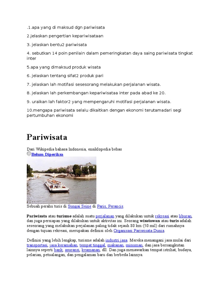 Wisatauntuk mendapatkan gambaran yang lebih jelas tentang kepariwisataan irawan 2010 11 menjabarkan kata kata yang berhubungan dengan kepariwisataan sebagai berikut wisata. Perjalanan itu walaupun apa bentuknya harus selalu dikaitkan dengan bertamasya dan rekreasi melihat dan menyaksikan atraksi atraksi wisata. Wisata kesehatan yaitu perjalanan seseorang dengan tujuan untuk menukar keadaan dan lingkungan tempat sehari hari dimana ia tinggal demi kepentingan beristirahat dalam arti jasmani maupun rohani. Motivasi merupakan faktor penting bagi calan wisatawan di dalam mengambil keputusan mengenai daerah tujuan wisata yang akan dikunjungi.