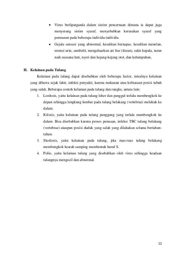 Gangguan tulang pada bagian tulang belakang melekuk seperti huruf s disebut. Lengkungan tulang dapat berbentuk laksana huruf s atau c. Posisi tulang yang salah atau tidak pada tempatnya dapat memengaruhi postur tubuh anda termasuk posisi tulang pada tulang belakang. Ditemukan pada diskus intervertebralis jaringan ikat yang terletak diantara tiap ruas tulang belakang pada orang tua diskus intervertebralis yang 80 nya terdiri dari air mulai kekurangan elastisitas akibat jumlah air yang berkurang sehingga pada orang tua pun mudah terjadi gangguan seperti nyeri pada tulang belakang dan habitat membungkuk. Kondisi ini paling sering menyerang anak dan remaja mengikuti olahraga yang melibatkan tekanan berulang pada punggung bawah seperti senam angkat beban dan sepak bola.