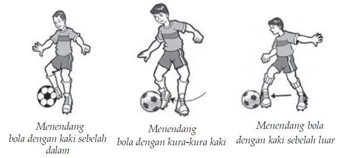 Bagian atas bola c. Kaki kiri atau yang digunakan untuk menumpu diletakkan di samping bola dengan sedikit menekuk. Menggiring bola dribbling adalah upaya mendorong atau membawa bola ke arah tertentu sambil berlari sehingga bola bergulir di tanah dan tetap dikuasai oleh pemain. Menendang bola dengan kaki bagian dalam.