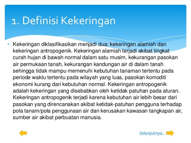 Kekeringan alamiah dan kekeringan antropogenik. Kekeringan alamiah terjadi akibat tingkat curah hujan di bawah normal dalam satu musim kekurangan pasokan air permukaan dan air tanah kekurangan kandungan air di dalam tanah sehingga tidak mampu memenuhi kebutuhan tanaman tertentu pada periode waktu tertentu pada wilayah yang. Definisi kekeringan kekeringan diklasifikasikan menjadi dua. Kekeringan merupakan fenomena hidrologi yang paling kompleks perwujudan dan penambahan isu isu berkaitan dengan iklim tata guna lahan norma pemakaian air.