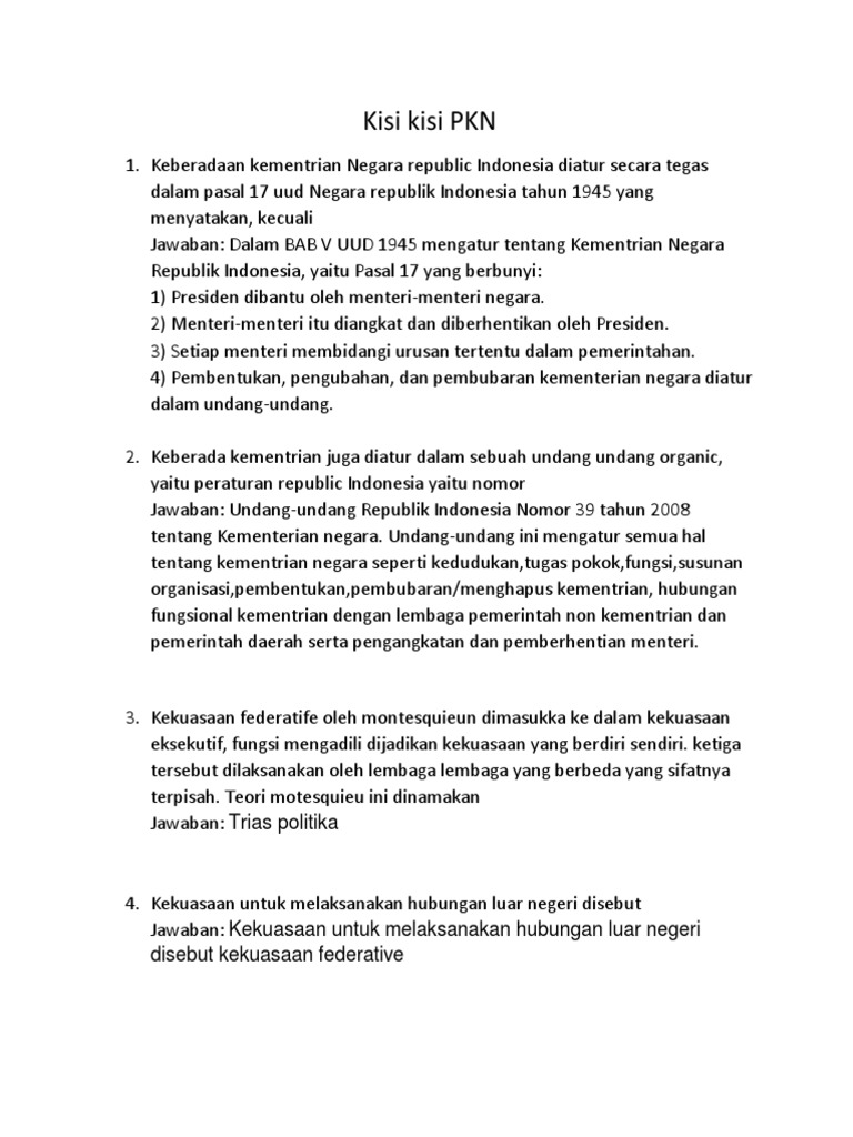 Kekuasaan untuk melaksanakan undang undang disebut kekuasaan. Setelah amandemen dpr memegang kekuasaan membentuk undang undang. Jawaban pendahuluan indonesia dalam menjalankan sistem kepemerintahannya menggunakan konsep trias politika. Kekuasaan eksekutif yaitu kekuasaan untuk melaksanakan undang undang termasuk kekuasaan untuk mengadili setiap pelanggaran terhadap undang undang. Kekuasaan ini dipegang oleh presiden sebagaimana ditegaskan dalam pasal 4 ayat 1 uud negara republik indonesia tahun 1945 yang menyatakan bahwa presiden republik indonesia memegang kekuasaan pemerintahan menurut undang undang dasar 3 kekuasaan legislatif adalah kekuasaan untuk membentuk undangundang.