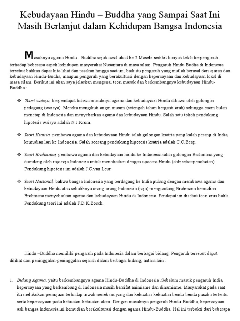 Ada 5 teori masuknya hindu buddha di nusantara yaitu teori brahmana teori waisya teori ksatria teori arus balik dan teori sudra. Inti dalam agama hindu adalah pengakuan terhadap kitab kitab weda sebagai wahyu yang mutlak kebenaranya kepercayaan terhadap dharma pengakuan supremasi para brahmana penerimaan system kasta serta memenuhi kewajiban ritual kesusilaan dan social yang bersangkutan dengan itu dan kepercayaan akan sangsara dan karma hassan shadily enskl. Van leur berpendapat bahwa agama hindu di bawa oleh para brahmana atau para pendeta ke indonesia ia berpendapat seperti itu karena para brahmana lah yang mengetahui kitab weda. Krom berpendapat bahwa pembawa agama hindu adalah.