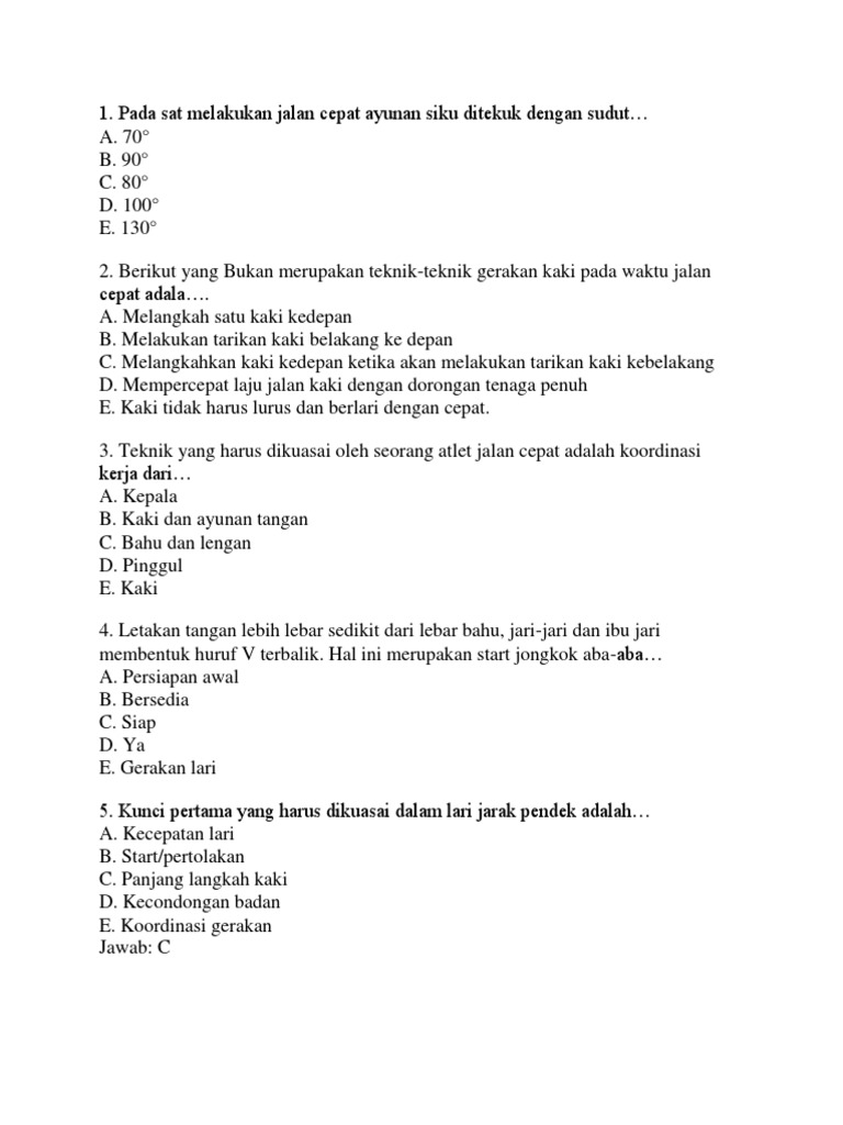 Kepala sedikit membungkuk sehingga tidak menyebabkan leher tegang. Bahu condong ke depan. Teknik yang harus dikuasai oleh seorang atlet jalan cepat adalah koordinasi kerja dari a. Hal in merupakan start jongkok aba aba.