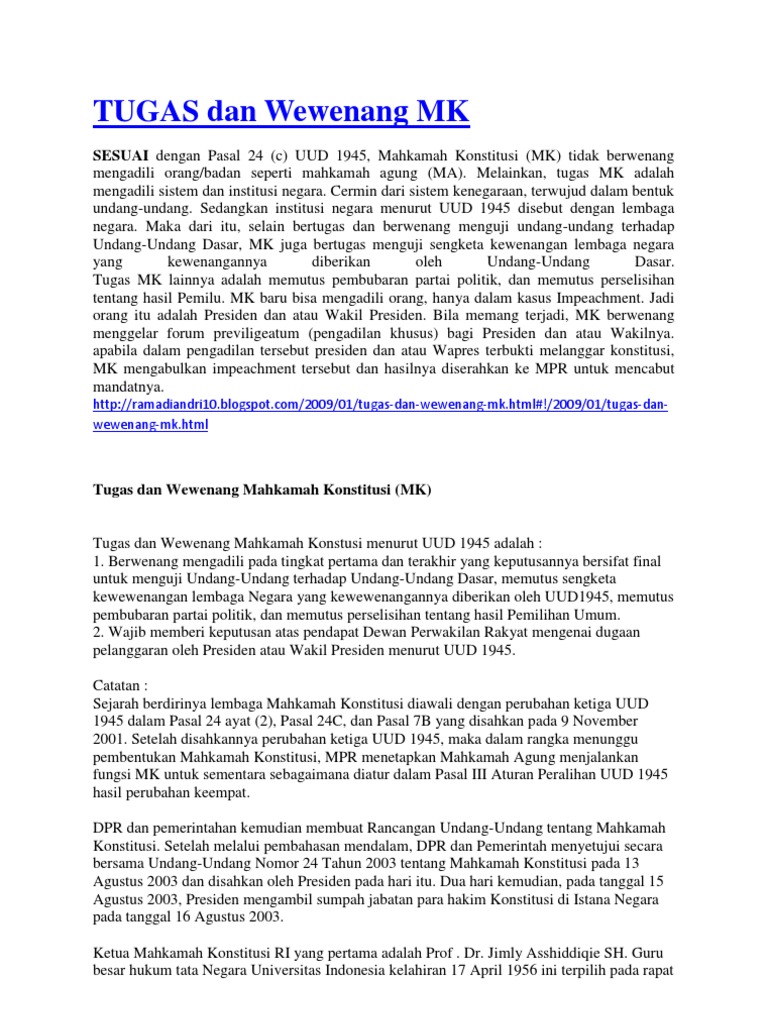 Memutus pembubaran partai politik dan memutus hasil perselisihan tentang pemilu tugas dan wewenang lembaga negara dari. Selain itu berdasarkan pasal 7 ayat 1 sampai dengan 5 dan pasal 24c ayat 2 uud 1945 yang ditegaskan lagi oleh pasal 10 ayat 2 uu 24 2003. Bpk mempunyai tugas dan wewenang yang sangat strategis karena menyangkut aspek yang berkaitan dengan sumber dan penggunaan anggaran serata keuangan negara yaitu. Dan memutus perselisihan tentang hasil pemilihan umum. Lembaga negara yang kewewenangannya diberikan oleh uud1945 memutus pembubaran partai politik dan memutus perselisihan tentang hasil pemilihan umum.