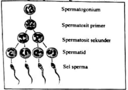 Peralihan dari bakal sel kelamin yang aktif membelah ke sperma yang masak serta menyangkut berbagai macam perubahan struktur yang berlangsung secara berurutan. Urutan perkembangan sel telur yang telah dibuahi adalah sebagai berikut. Sperma dihasilkan pada testis. Pada spermatogenesis terjadi pembelahan secara mitosis dan meiosis.