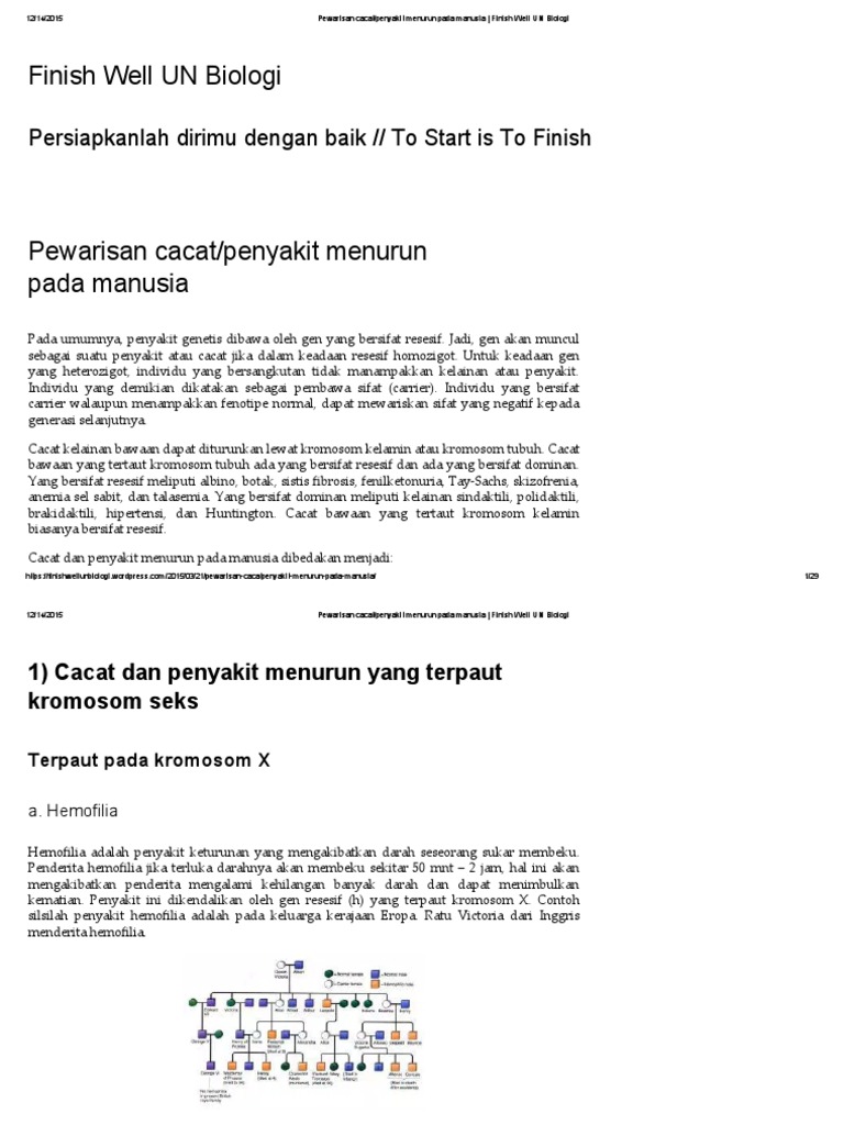Penyakit berupa gangguan koagulasi herediter yang disebabkan oleh mutasi gen faktor viii atau faktor ix sehingga dapat dikelompokkan menjadi hemofilia a dan hemofilia b. Individu yang buta terhadap zat warna hijau type deutan dan merah type protan dikarenkan individu tersebut tidak mempunyai reseptor yang dapat mendeteksi cahaya pada panjang gelombang hijau atau merah. Berbagai penyakit penyebab gangguan kelainan keturunan tersebut menyebabkan ketidak normalan bentuk fisik maupun fisiologis dari penderitanya. Yang dimaksud dengan penyakit menurun autosom adalah penyakit yang diwariskan melalui kromosom autosom dan tidak tergantung pada jenis kelamin.