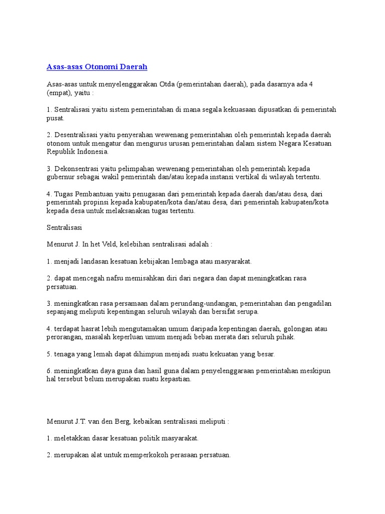 Penyerahan wewenang pemerintah oleh pemerintah kepada daerah otonom disebut. Penyerahan wewenang pemerintahan oleh pemerintah kepada daerah otonom untuk mengatur dan mengurus urusan pemerintah dalam sistem nkri disebut asas 5224508. Sedangkan pada undang undang nomor 22 tahun 1999 pasal 1huruf e disebutkan bahwa desentralisasi adalah penyerahan wewenang pemerintahan oleh pemerintah kepada daerah otonom dalam kerangka negara kesatuan republik indonesia. 32 tahun 2004 pasal 1 ayat 5 pengertian otonomi derah adalah hak wewenang dan kewajiban daerah otonom untuk mengatur dan mengurus sendiri urusan pemerintah dan kepentingan masyarakat setempat sesuai dengan peraturan perundang undangan sedangkan menurut suparmoko 2002 61 mendefinisikan otonomi daerah sebagai kewenangan daerah otonom. 2 untuk menyelenggarakan otonomi pemerintahan pusat menyerahkan sejumlah urusan pemerintahan sebagai urusan rumah tangga daerah otonom kepada daerah.
