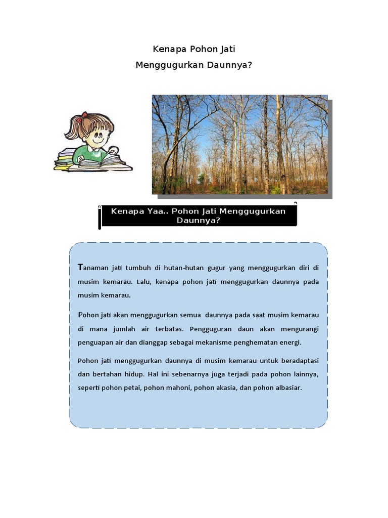 Pohon jati menggugurkan daunnya dengan tujuan. Hutan jati di bojonegoro jawa timur pada musim hujan daun tumbuhan seperti pohon jati dan akasia mengurangi penguapan dengan cara menggungurkan daunnya di musim panas. Pohon jati akan menggugurkan semua daunnya pada saat musim kemarau di mana jumlah air terbatas. Menggapai cita cita bangsa c. Penguapan tersebut terjadi di daun sehingga daun pohon jati perlu digugurkan.