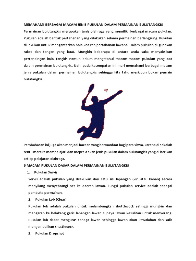 Pukulan yang dilakukan sebelum bola jatuh kelapangan disebut pukulan. Underhand lob yaitu pukulan lob yang dilakukan dari bawah dengan cara memukul shuttlecock yang berada di bawah badan dan di lambungkan tinggi ke belakang. Pukulan clear pukulan ini memiliki tujuan untuk membuat bola menjauh dari lawan sehingga membuat lawan bergerak lebih cepat dan bisa membuat lawam lebih lelah. Posisi dalam memukul bola disebut dengan preparation. Netting sesuai namanya ini adalah jenis pukulan yang bertujuan agar kok jatuh tepat di net setelah berhasil melewatinya.