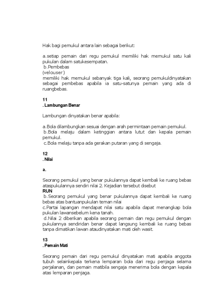 Ketika sudah selesai memukul pemukul wajib untuk meletakkan alat pemukul di dalam ruang pemukul dan jika pemukul keluar daerah zona pemukul maka pemain pun akhirnya tidak akan mendapatkan nilai. Tim pemukul setiap orang memiliki hak untuk memukul bola satu kali kecuali pemain terakhir memiliki kesempatan sebanyak tiga kali. Peraturan permainan kasti pemain waktu permaianan dan wasit. Waktu istirahat 10 menit.