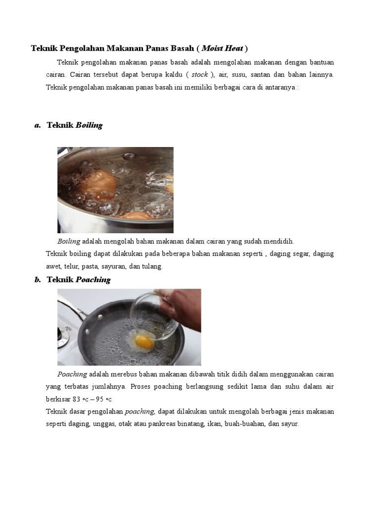 Teknik mengolah bahan makanan dalam cairan yang sudah mendidih adalah teknik. Pastinya tekstur dan rasa makanan yang dihasilkan berbeda dengan teknik memasak basah ya. Caranya bahan makanan dapat dimasukkan ke dalam cairan yang masih dalam keadaan dingin atau dalam air yang panas. Teknik merebus boiling adalah mengolah bahan makanan dalam cairan yang sudah mendidih. Yang satu berisi air yang satu berisi makanan.
