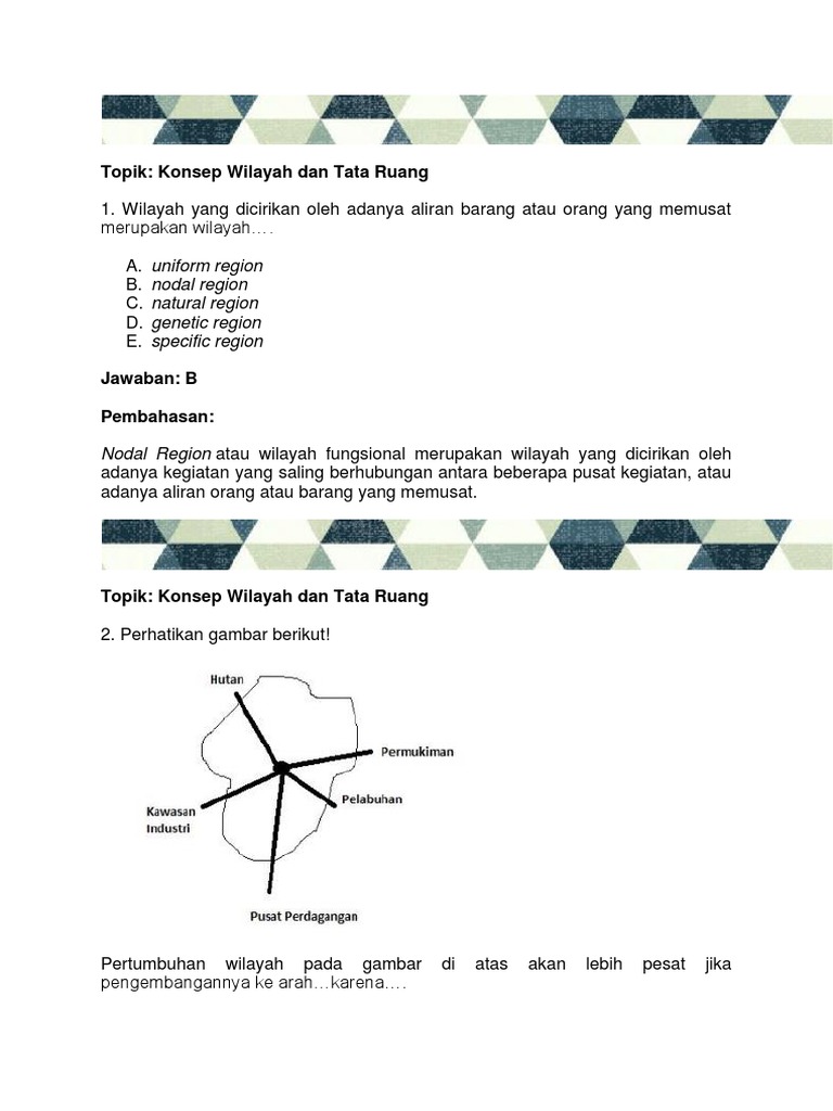 Konsep wilayah dan tata ruang. Wilayah yang dicirikan oleh adanya aliran barang atau orang yang memusat merupakan wilayah. Misalnya jakarta bogor depok tangerang dan bekasi jabodetabek yang secara fisik memiliki kondisi yang berbeda heterogen namun secara fungsional saling berhubungan dalam memenuhi kebutuhan hidup. Nodal region atau wilayah fungsional merupakan wilayah yang dicirikan oleh adanya kegiatan yang saling berhubungan antara beberapa pusat kegiatan atau adanya aliran orang atau barang yang memusat.